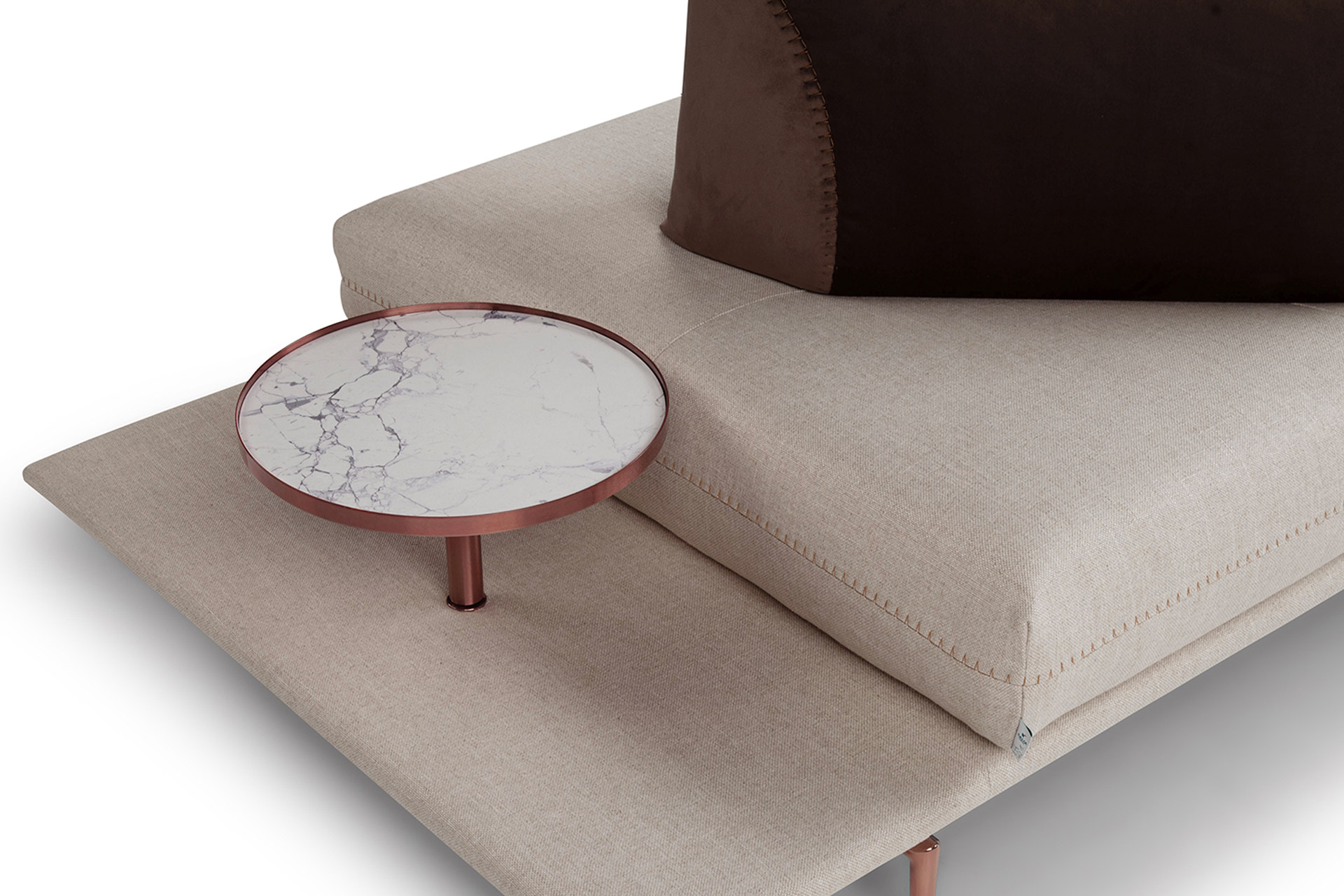 Zadní polštáře jsou opět inspirované známými italskými čokoládovými bonbony a stejně jako sedák jsou zdobeny prošívaným efektem. Pohovku můžete vkusně doplnit praktickým odkládacím stolkem který vystupuje za samotné konstrukce.
